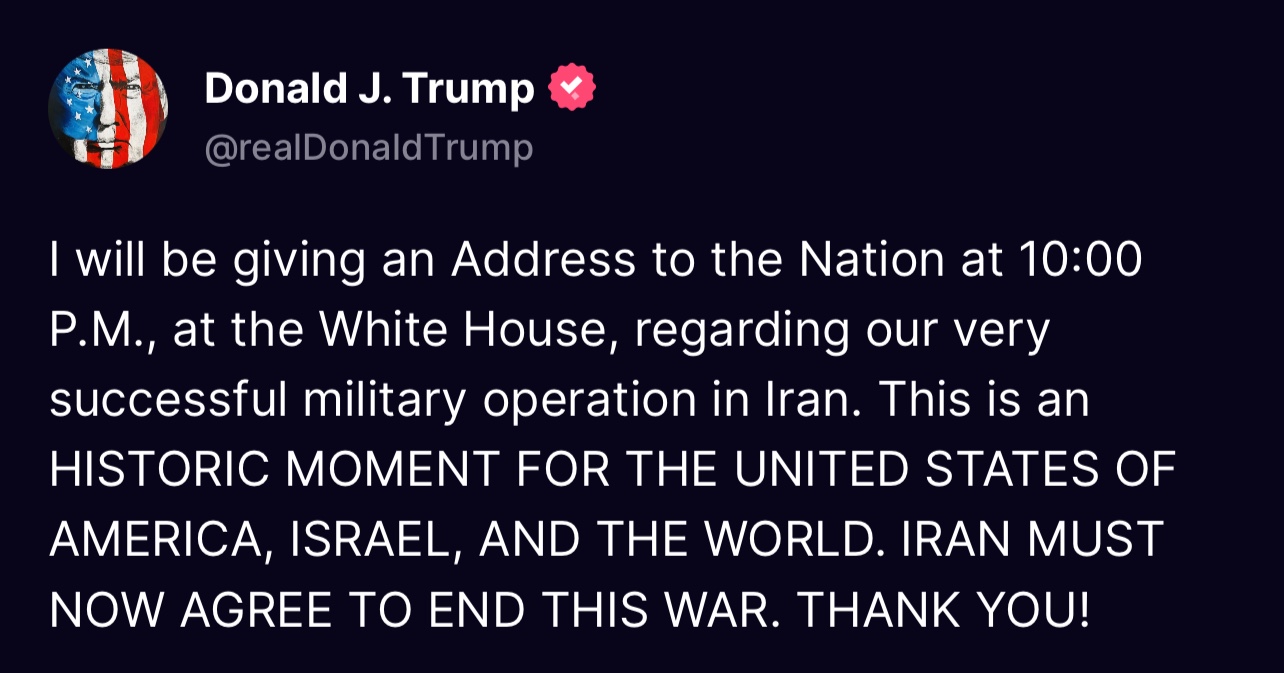 트럼프는 “미국, 이스라엘, 세계를 위한 역사적 순간(HISTORIC MOMENT)”이라며, 이번 공습을 자국 안보와 국제 질서 수호를 위한 결정적인 조치로 강조했다.